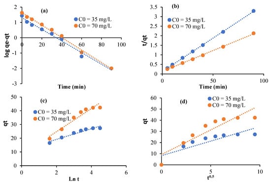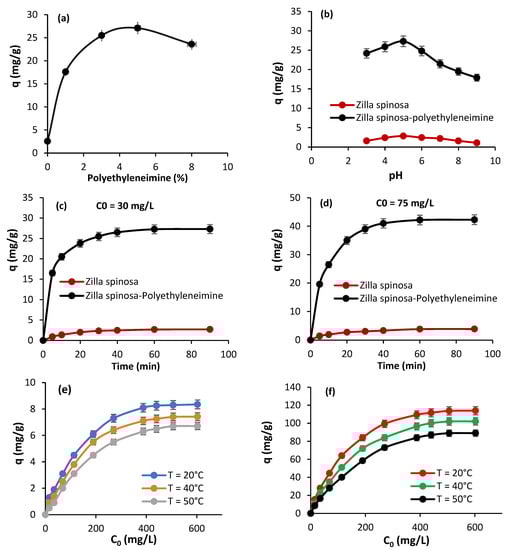 The effect of time on the adsorption capacity is shown in Figure 7c,d (C0 = 30 mg/L, pH = 5, T = 20 °C). Results demonstrate that the adsorption rate of calmagite using Zilla spinosa-polyethyleneimine and virgin Zilla spinosa is rapid, and the equilibrium is approximately achieved after 60 min of contact. Regarding the obtained plots, the profile kinetic displays two important adsorption stages. From 0 min to 20 min, the adsorption is very fast, and more than 90% of the target is attained. During this stage, many adsorption sites are accessible at the adsorbent surface. Further, the adsorption continues slowly and achieves the maximum value at 60 min, which could be explained by the saturation of the active adsorption sites at this final stage of the process.