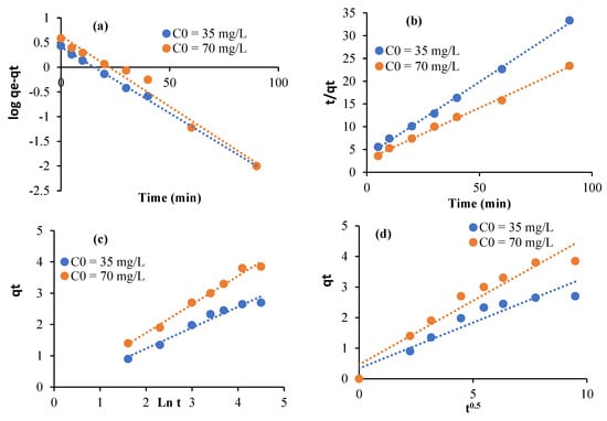 Kinetic plots related to the adsorption of calmagite for virgin Zilla spinosa: (a) log (qe − qt) versus time, (b) t/qt versus time, (c) qt versus Ln t, and (d) qt versus t0.5.