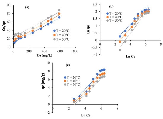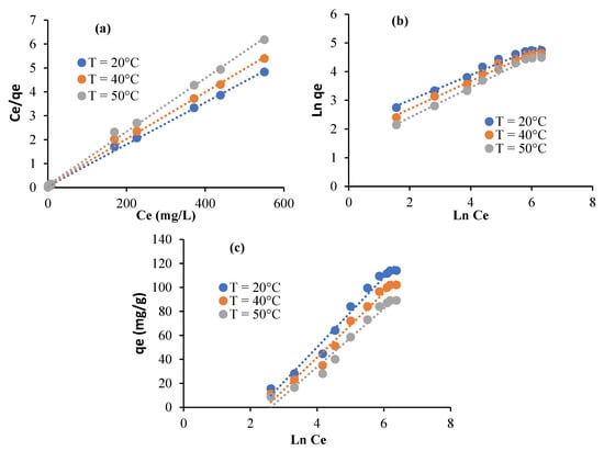 Isotherms plots related to the adsorption of calmagite for Zilla spinosa-polyethyleneimine: (a) ce/qe versus ce, (b) Ln qe versus Ln ce, and (c) qe versus Ln ce.