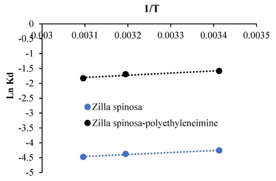 The thermodynamic parameters, such as ΔH° and ΔS°, are calculated by plotting the values of Ln (Kd) against 1/T (Figure 12). The positive value of ΔG° confirms that the adsorption of calmagite is nonspontaneous. The negative value of ΔH° proves that the interaction between Zilla spinosa, Zilla spinosa-polyethyleneimine, and calmagite is exothermic. This trend agrees well with the decrease of the adsorption capacity of calmagite with increasing temperature. The negative values of ΔS° reveal the reduction of the disorder in the considered system calmagite-Zilla spinosa, in which some physical alterations could occur [28].