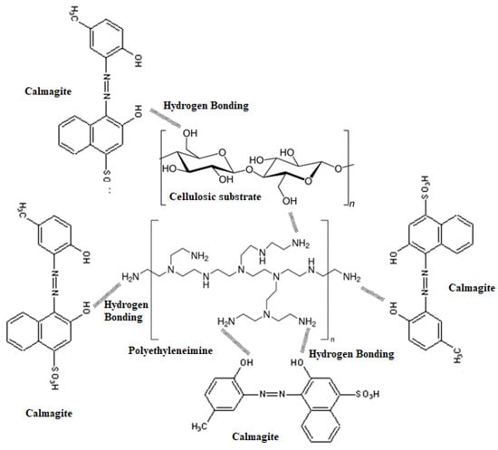 Scheme 1 gives a probable mechanism showing a possible interaction between the cellulosic biomaterial, polyethyleneimine, and calmagite.