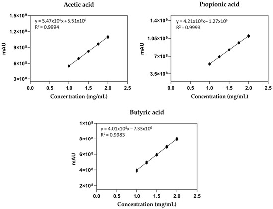 Chicago/Turabian StyleDíaz-Corona, Lenin Rodolfo, Karina Jeanette Parra-Saavedra, Renata Sofia Mora-Alonzo, María Esther Macías-Rodríguez, Alma H. Martínez-Preciado, Santiago José Guevara-Martínez, Adalberto Zamudio-Ojeda, and Adriana Macaria Macias-Lamas. 2023. "HPLC-DAD Development and Validation Method for Short-Chain Fatty Acids Quantification from Chicken Feces by Solid-Phase Extraction" Separations 10, no. 5: 308. https://doi.org/10.3390/separations10050308