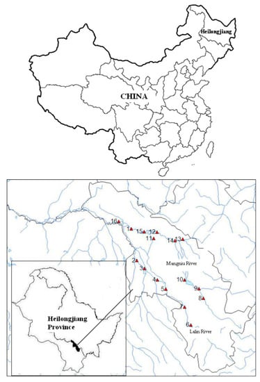 Figure 1 shows the study area and Table 1 shows the specifics of the sampling locations. Each sampling location is within 120 km of Mopanshan Reservoir. Wuchang City is a part of Heilongjiang Province in Northeastern China. A chilly monsoon typically characterizes the area, with an average annual temperature of 3.5 °C. The Lalin and Mangniu rivers both travel through the Wuchang region and are among its many abundant water resources. The Mopanshan Reservoir situated in the Lalin river is a significant drinking water source for Harbin city, the capital of Heilongjiang Province. The Longfengshan Reservoir is situated on the upper levels of the Mangniu River. The dam site for Mopanshan Reservoir, which has the highest level of any reservoir on the Lalin River’s main stream, is situated upstream from the Lalin River in Shenjiaying Village, Shahezi Town, Wuchang City, Heilongjiang Province. It is 8 km away, 343 km from the river’s mouth, and the dam’s location is around 180 km from Harbin’s downtown. The reservoir’s geographic coordinates are E127°41′20″, N44°23′40″. During the winter season’s low water period (LWP) in December 2007 and the summer season’s high water period (HWP) in September 2008, a total of 32 pairs of samples were taken, including 32 water samples and 32 sediment samples (Figure 1). In Figure 1, sixteen sampling locations are depicted. Using 4.5 dm3 glass jars, water samples were taken from 0.5 m below the water’s surface. Using a grab sampler, sediment samples were taken. Near the silt, soil samples were gathered. The sampling stations were located using a global positioning system (GPS) during the entire sampling operation. After collection, all samples were immediately brought to the lab and kept there for two days at 4 °C before being extracted.