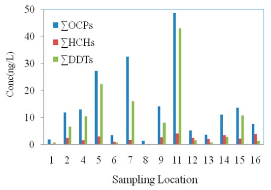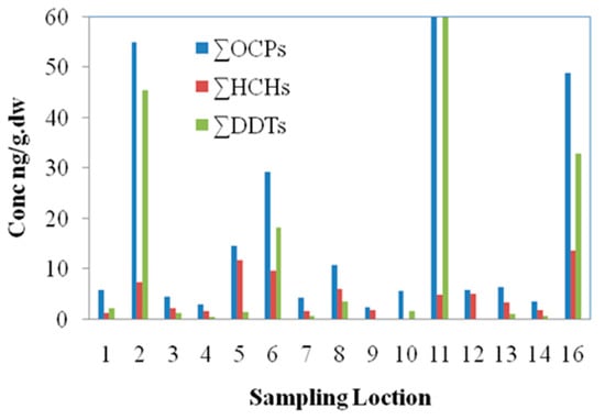 The highest level was found at site 11, where the ∑DDT (containing p,p-DDE, p,p’-DDD, o,p’-DDT, and p,p’-DDT) was 6.43 ng/g dry wt., covering 83% of the ∑OCPs concentration for this site. The ∑OCPs ranged from 0.42 to 7.78 ng/g dry wt. (mean 2.18 ng/g dry wt.).