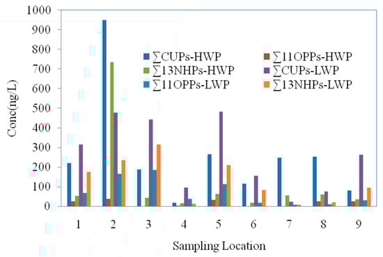 Two common kinds of CUPs in the study area are OPPs and NHPs. The ∑OPPs in the surface water varied from the LoD to 180 ng/dm3 (mean 46 ng/dm3). Disulfoton had the greatest detection rate of the 11 OPPs at 63%, while methyl-paraoxon, methyl-parathion, and parathion were not found in the water samples. Except for demeton, disulfoton, malathion, and chlorpyrifos, which had very low detection frequencies ranging from 11.1 to 33.3%, none of the 11 types of OPPs were identified in the HWP, where the ∑OPPs ranged from the LoD to 38 ng/dm3 (mean, 16 ng/dm3).