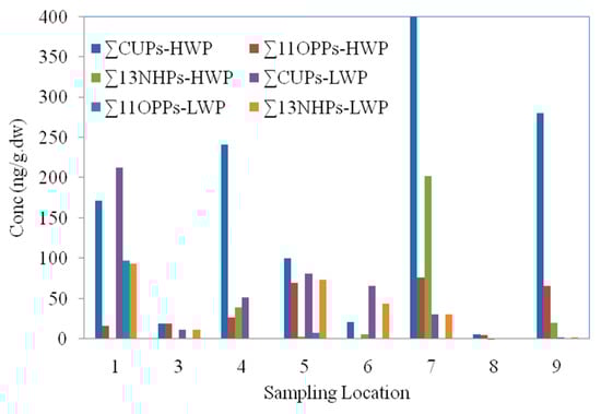 In the LWP, the frequency of OPPs detection in the sediment was extremely low; only demeton, malathion, methyl paraoxon, rogor, and chlorpyrifos were found, and the ΣOPPs ranged from the LoD to 96.9 ng/g dry wt. (mean 14.9 ng/g dry wt.). Except for chlorpyrifos-methyl, parathion-methyl, and parathion, which were not detectable in the HWP, 8 different types of OPPs were found, and the ΣOPPs ranged from the LoD to 76.0 ng/g dry wt. (mean 30.7 ng/g dry wt.).