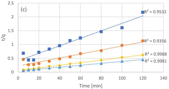 Experimental results of batch adsorption of the NF retentate fraction of olive leaf extract using different adsorbent concentrations (C1 = 20 g/L, C2 = 40 g/L, C3 = 80 g/L, and C4 = 120 g/L) (a) and fitting after linearization for pseudo-first (b), and pseudo-second (c) order kinetics.