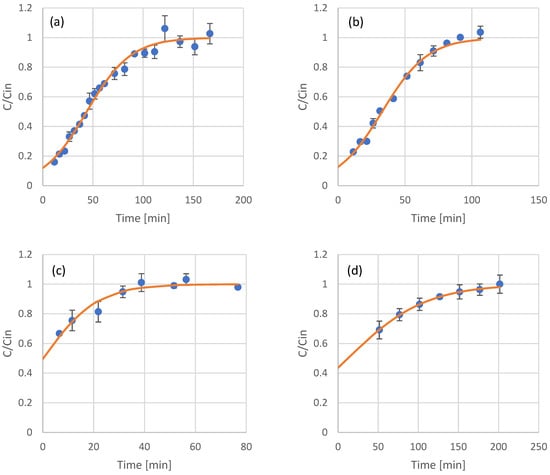 Experimental results (scattered symbols) and Thomas model fitting (continuous line) of the use of adsorption resin packed columns for the adsorption of phenols from olive leaf extract (a), UF retentate of olive leaf extract (b), NF retentate of olive leaf extract (c), and NF permeate of olive leaf extract (d).
