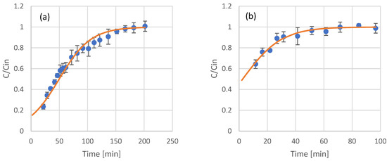 Most of the applications involving adsorption processes are operated in continuous mode. After the results and modeling of the batch adsorption experiments, continuous experiments with resin-packed columns were conducted. The samples tested included the raw extracts of olive leaves and coffee residues, as well as fractions that were produced after their in-line membrane filtration. For modeling of the eluent concentration of phenols at the adsorption column outflow, the Thomas model was used. The results and model fitting for olive leaf phenols are presented in Figure 3, while the results and model fitting for coffee residue extracts are presented in Figure 4. The estimated model parameters and model fitting accuracy (in terms of R2) are presented in Table 4.