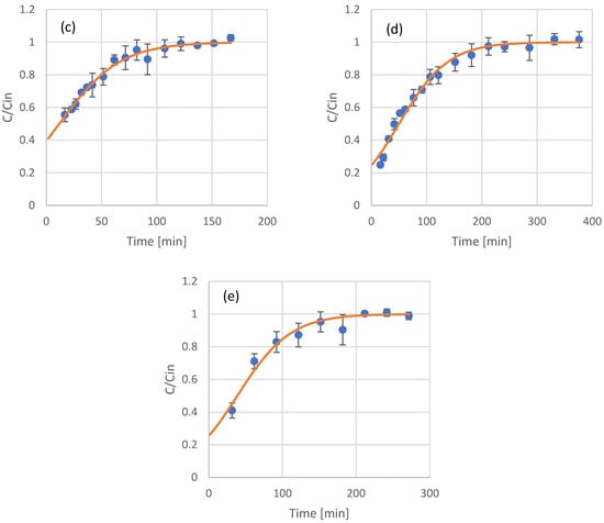 Experimental results (scattered symbols) and Thomas model fitting (continuous line) of the use of adsorption resin packed columns for the adsorption of phenols from coffee residues extract (a), UF retentate of coffee residue extract (b), UF permeate of coffee residue extract (c), NF retentate of coffee residue extract (d), and NF permeate of coffee residue extract (e).