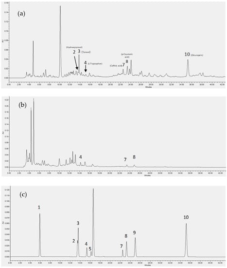 HPLC analysis of the phenolic content of olive leaf extract NF retentate prior (a) and after the column adsorption process at elution time 6.55 min (b), and the standards used for the qualitative analysis (c). 1: Gallic acid monohydrate, 2: Hydroxytyrosol, 3: Tyrosol, 4: L-Tryptophan, 5: (+)-Catechin hydrate, 6: (-)-Epicatechin, 7: Caffeic acid, 8: p-Coumaric acid, 9: trans-Ferulic acid, 10: Oleuropein.