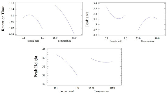 Figure 2 shows the individual effects of formic acid and column temperature on the chromatogram retention time. The results indicated that increasing the column temperature resulted in shortening the chromatogram retention time, while formic acid at lower concentrations resulted in increasing the retention time, followed by increasing retention at higher formic acid levels, but both effects were insignificant.