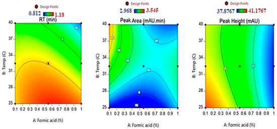 The contour plots, as shown in Figure 3, on the effects of formic acid and column temperature on the peak height of the drug chromatogram denote that the highest values in the chromatogram peak height were obtained at lower values of formic acid and temperature. Moreover, higher values in the response were noticed for low formic acid concentrations with medium and higher temperatures.