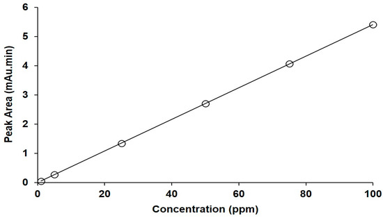 The UPLC assay method for FU was linear in the concentration range from 1 to 100 ppm, as shown in Figure 5. The correlation coefficient was 0.999, with a linear regression equation of Y = 0.0541X − 0.0076.