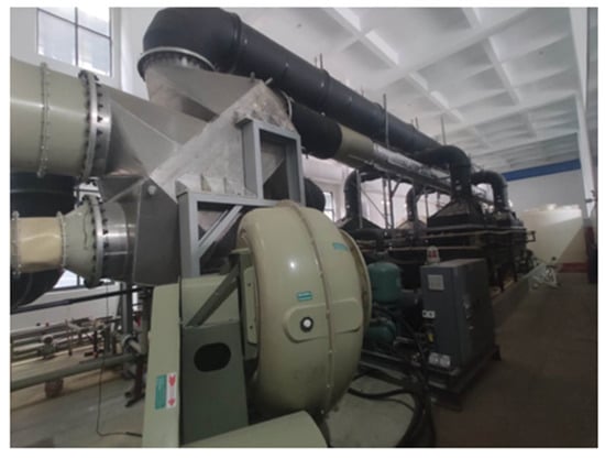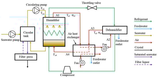 The closed-cycle evaporation system presented in this study was established in Hefei, China [22]. The system consists of humidifiers, two dehumidifiers, and a heat pump unit. The process flow of the system is shown in Figure 1. Figure 2 shows a photograph of the system.The closed-cycle evaporation system contains three media circulations during operation.