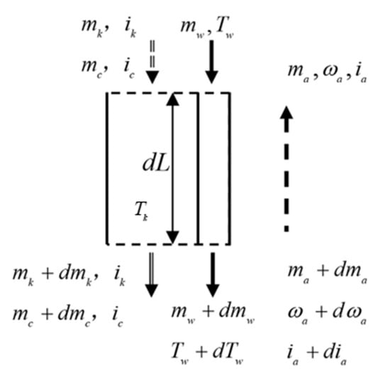 In the sub-model of the humidifier, the heat exchanger coil is simplified. The flow direction of refrigerant is assumed to be vertically downward, parallel to the direction of seawater movement, and the circulating air flows vertically upward. Figure 3 shows the heat and mass transfer analysis unit.
