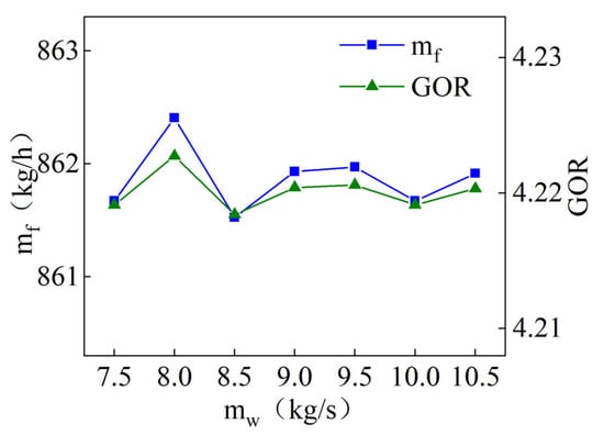 By varying the speed of the seawater pump, the seawater mass flow can be adjusted. Figure 5 shows the effect of seawater mass flow on freshwater production and the GOR. During this calculation, the ambient air condition at the inlet of the radiator fan was (Ta5 = 20 °C, RHa5 = 65%).