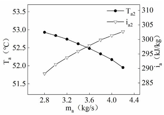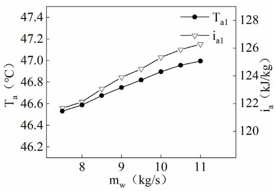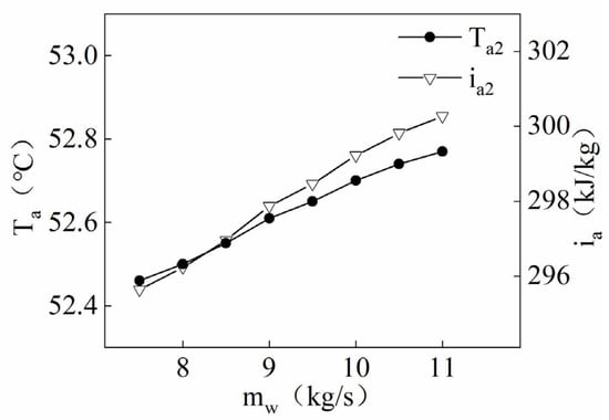 The heat generated by the condensation of the refrigerant in the humidifier is first transferred to the water film wrapped around the outer wall of the tube, and then the heat is transferred to the air. The increase in the air mass flow rate increases the humidity and enthalpy difference between the surface of the water film and the air, accelerating the efficiency of heat mass transfer between the water film and the air. Figure 9 demonstrates that an increase in the air mass flow rate leads to an increasing temperature and enthalpy of the air at the humidifier inlet. Figure 10 shows that the increase in the air mass flow rate reduces the temperature of the air at the humidifier outlet, but the enthalpy of the air increases. The increase in the air mass flow rate not only increases the efficiency of heat and mass transfer between the air inside the humidifier and the water film outside the heat transfer coil but also reduces the time for heat mass transfer between the air and the water film. The change in air enthalpy is mainly influenced by the latent heat exchange between the air and the water film. The increase in air mass flow promotes the evaporation of the water film, resulting in a higher enthalpy of air leaving the humidifier and a higher share occupied by latent heat transfer, which means that the share occupied by sensible heat transfer is reduced. The change in air temperature is mainly related to the sensible heat exchange between the air and the water film, with the sensible heat transfer occupying a lower share of the heat transfer, resulting in a lower temperature for the air leaving the humidifier. Although the air leaving the humidifier has a lower temperature, its enthalpy is higher, and the heat transfer within the first-level dehumidifier occupies only a smaller share of its heat. When the air with higher enthalpy enters the secondary dehumidifier and releases most of its heat, the air leaving the secondary dehumidifier is saturated. Based on the assumption that the cooling capacity of the compressor in the secondary dehumidifier is constant, the air with the higher enthalpy is relatively hot after it has released heat in the secondary dehumidifier. The main driver of heat transfer within the primary dehumidifier is the temperature difference, but the air leaving the humidifier only accounts for a smaller share of the heat released within the secondary dehumidifier; in addition, according to the control equations for the secondary dehumidifier, an increase in the air mass flow rate increases the heat transfer efficiency of the secondary dehumidifier, ultimately leading to an increase in the temperature and enthalpy of the air entering the humidifier.