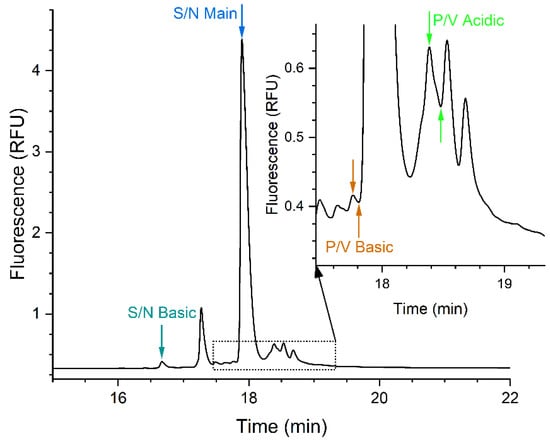 Exemplary electropherogram of NISTmAb obtained with photomultiplier high voltage supply (PMHV) of 520 V, rise time (RiT) 0.8 s, and frequency of 20 Hz. The peaks and valleys used for the calculation of the responses’ signal-to-noise ratio of the main peak (S/N Main), the signal-to-noise ratio of the first basic peak (S/N Basic), the peak-to-valley ratio of the last basic peak (P/V Basic), and the peak-to-valley ratio of the first acidic peak (P/V Acidic) are indicated. The noise was determined by means of a blank run with water [38].