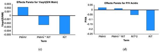 Pareto chart of the four responses: S/N Basic (a); P/V Basic (b); S/N Main (c); P/V Acidic (d). Please note that in case of the S/Ns, the transformed response (1/square root) is considered. The frequency is abbreviated to “Fr” in this figure.