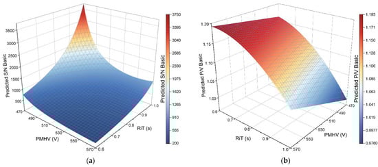 The influence of factors on the responses is visualized in the surface response plots in Figure 3. They show the dependence of the predicted response (z-axis) on the two factors of PMHV and RiT. Since this type of plot allows only two dependent variables, the third dependent variable, frequency, was set to be constant, with a value of 100 Hz. For each combination of x- and y-value (factors), the corresponding predicted response value is shown (z-value). The calculated z-values result in a plane, which is colored accordingly to the z-values (high: dark red, low: dark blue). Curvatures of the plane are the result of interaction terms.