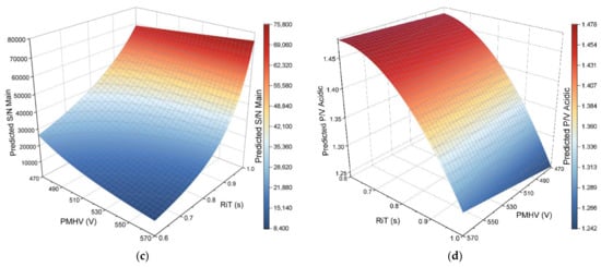 Surface response plots of the responses: S/N Basic (a); P/V Basic (b); S/N Main (c); P/V Acidic (d). The factors PMHV and RiT are on the x- and y-axis. The factor “frequency” was set to 100 Hz. The predicted response is shown on the z-axis. Additionally, the color of the plane corresponds to the predicted z-value (high: dark red—mid: white—low: dark blue), as indicated in the respective color scale.