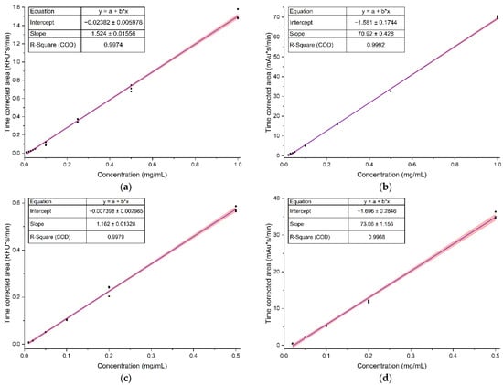 as recommended by Baumann and Wätzig [48]. For this, the built-in weighting procedure of Origin (“Instrumental”) was used. The resulting calibration curves are shown in Figure S10. In contrast to the calibration curves presented in Figure 2, the mean values were used for the regression in combination with the aforementioned weighting.