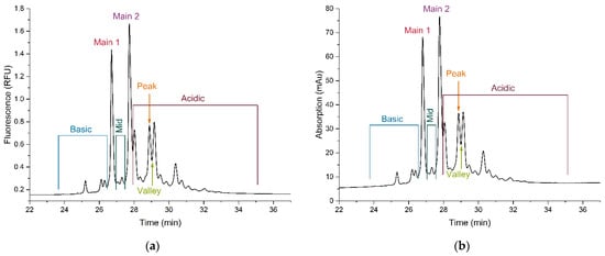 The S/N was evaluated using the main peak of each mAb. Blank electropherograms (water injection) were used for the calculation of the noise [38]. The obtained values are summarized in Table 2. Exemplary electropherograms of matuzumab at all concentration levels and obtained with both detection modes are provided in Figures S2–S5. Likewise, exemplary electropherograms of NISTmAb are provided in Figures S6–S9. Based on the S/N, LODs and LOQs were estimated, whereby the limits of S/N ≥ 3 for the LOD and S/N ≥ 10 for the LOQ were derived from the Ph. Eur. 2.2.47 and ICH Q2(R1) guideline [38,39]. For the estimation, the S/Ns at 0.01 and 0.02 mg/mL (both mAbs and detection modes) were used, and linear regression was performed. The obtained linear equation was further used, values of 3 or 10 were inserted for the S/N, and the equation was solved for the concentration. The results were estimated LODs of 6.924 µg/mL and 5.662 µg/mL for matuzumab with UV detection and LEDIF detection, respectively. The LOQs were estimated at 10.73 µg/mL (UV detection) and 6.203 µg/mL (LEDIF detection). For NISTmAb, the estimated LODs were 10.27 µg/mL (UV detection) and 5.699 µg/mL (LEDIF detection). Likewise, the estimated LOQs were 16.23 µg/mL (UV detection) and 6.919 µg/mL (LEDIF detection).