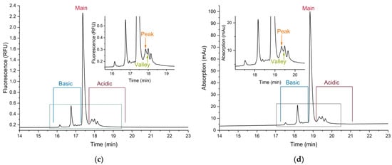 Exemplary electropherograms are provided in Figure 5a,b (Waters mAb), and Figure 5c,d (NISTmAb). The obtained mAb profiles (Figure 5) showed a very good agreement, and all peaks observed with UV detection were also seen in the electropherograms obtained with LEDIF detection. As indicated in Figure 5a,b, the Waters mAb peak profile was divided into five groups: basic, main 1, mid, main 2, and acidic. The division of the peak profile into five groups, with two peaks labelled “main”, was adopted from previous experiments with this mAb [29]. The migration times of the highest peak (“main 2”) and the P/Vs of the indicated acidic peak were determined. Furthermore, the TCAs and from these, the percentage of the TCA from the total TCA (%area), were calculated for all aforementioned peak groups. Four electropherograms of Waters mAb obtained with LEDIF detection displayed a baseline shift, namely runs 1, 4, 5, and 26 (Figure S12). Therefore, they were excluded from the evaluation presented in Table 3. However, the evaluation with these four values included is provided in Table S6. For each measurement day, as well as for all three measurement days combined, the mean values, 95% CIs, SDs, and RSDs were calculated and are provided for both detection modes in Table 3. The individual measurements over the course of the measurement series are depicted in Figure S13, and the corresponding data are summarized in Table S7.