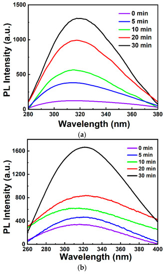 Using terephthalic acid as the capture agent of hydroxyl radical, fluorescence spectrometry was used for detection [24,25]. Figure 3 shows the fluorescence spectra of terephthalic acid solution in the ultrasonic system (I), the ultrasonic stirring synergetic system (II), and the synergetic system with iron powder (III) at different times.