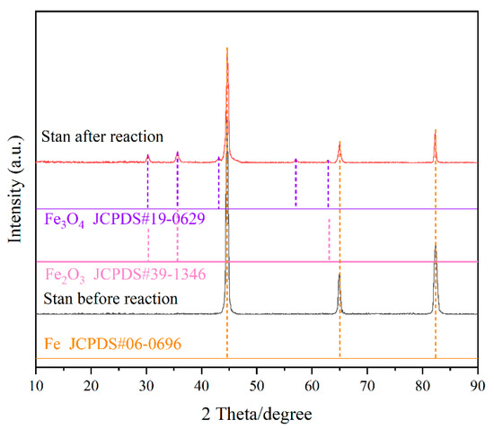 The results show that the iron powder before the reaction has strong characteristic diffraction peaks at 44.67°, 65.02° and 82.33°. The characteristic diffraction peak intensity of Fe0 in the precipitate after reaction is significantly reduced, while the characteristic diffraction peaks of Fe3O4 and Fe2O3 appear [28]. This result helps to verify the existence of the hydroxyl radical generation reaction (6)~(14).