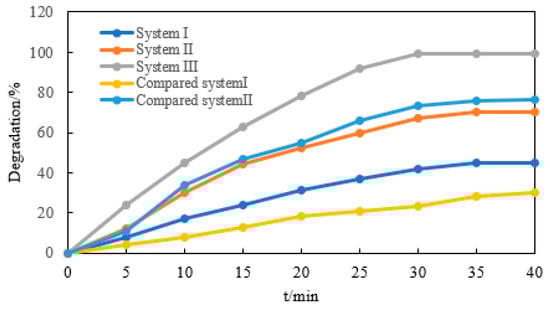 Congo red degradation reaction experiments were conducted on three systems and compared system I (without ultrasound in system I) and compared system II (without stirring in system III), as shown in Figure 5. The degradation rate of system (I) is 45%, and after adding stirring, the degradation rate of system (II) increases to 70%. This indicates that the synergistic system of ultrasound and stirring is beneficial for improving the degradation rate. In system (III), ferrous chloride was replaced by stan and sulfuric acid, and the degradation rate was further improved, indicating that stan and sulfuric acid was more conducive to the formation of hydroxyl radical. The degradation rate of compared system I was lower than that of system I, indicating that the contribution of ultrasound to hydroxyl radical was higher than that of stirring. The degradation effect of comparison system II is between system II and system III, which indicates that for this experiment, the contribution of iron powder and sulfuric acid to hydroxyl radical is higher than that of stirring.