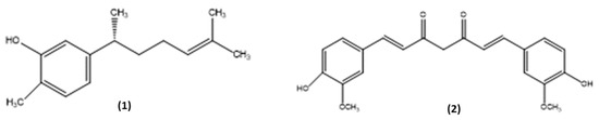 The selected chemical markers in hexane extract of C. Xanthorrhiza; xanthorrhizol (1) and curcumin (2).