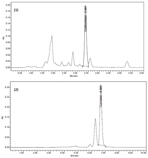 Three batches of the extract preparations were quantified under optimum running conditions. The retention times (RT) of Xnt and curcumin were found to be 3.4 min at 230 nm and 6.6 min at 425 nm, respectively, based on RT comparison of the standard compound. The quantity of the selected markers is listed in Table 1.