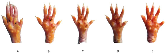 The appearance of black spots on the rat food pad 15 min post administration of (A) positive standard, (B) negative standard, (C) control, (D) 10 mg/kg extract, and (E) 160 mg/kg extract.