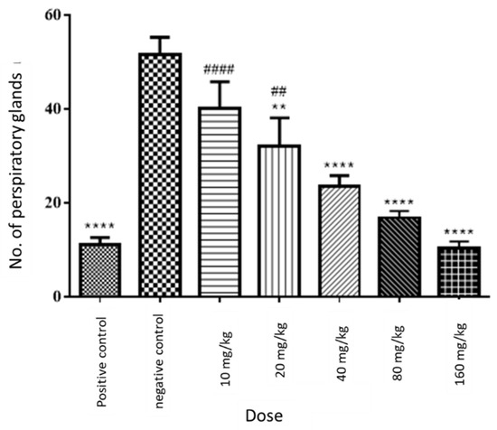 Antiperspirant effect of hexane extract of C. xanthorrhiza (n = 6, mean ± standard error of mean), one-way ANOVA, followed by Dunnet test; ** p < 0.001, **** p < 0.0001 as compared to negative control; ## p < 0.01, #### p < 0.0001 compared to positive control.
