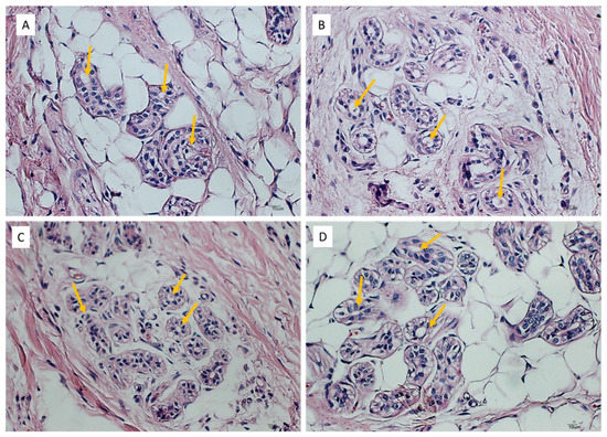 The observation of the lumen size is indicated with the arrows. The normal lumen size of the glands’ secretory units is small (Figure 5A). For the negative control group which was injected with pilocarpine HCI, the lumen size of the eccrine sweat gland expanded from large to moderate size (Figure 5B). The positive control group which was treated with 2% AlCl post pilocarpine injection showed a smaller size of the lumen compared to the negative control (Figure 5C). The sample group which was treated with the hexane extract of C. xanthorrhiza presented small- to medium-sized lumens, comparable to the positive control (Figure 5D).