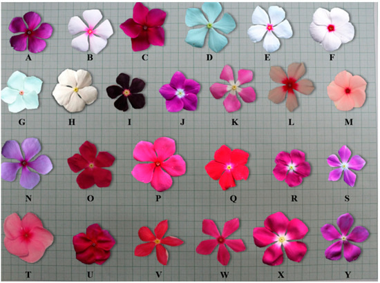 Flower characteristics (upper view) of 25 different accessions of C. roseus. (A) Cr00PFRE, (B) Cr00LPFLPE, (C) Cr00DPF, (D) Cr00WFYE, (E) Cr00WFRE, (F) Cr00WFRE2, (G) Cr00WFSRE, (H) Cr00WFYE2, (I) Cr00DP, (J) Cr00LP, (K) Cr00BPF, (L) Cr00SFP, (M) Cr00CAF, (N) Cr00LPNF, (O) Cr00SBRF, (P) Cr00PLMF, (Q) Cr00CHEF, (R) Cr00SNFF, (S) Cr00CLF, (T) Cr00SAF, (U) Cr00TDRF, (V) Cr00 DRYE, (W) Cr00FRFF, (X) Cr00PFWE, and (Y) Cr00PFYE.