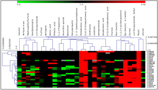 Figure 6 and Figure 7 show the score plots of PC1 and PC2 and also depict the relationship between metabolites and accessions. PC1 explained 21.55% of the total variance and discriminated the accessions based on the concentration of 9,12,15-octadecatrienoic acid methyl ester, phthalic acid, quinic acid, and phytol. Accessions Cr00SAF, Cr00CAF, Cr00LPNF and Cr00WFSRE showed variability for these components. The PC2 explained a further 12.18% of the variance and discriminated the accessions based on fructose, D-mannopyranoside, hexadecanoic acid, and 9,12,15-octadecatrienoic acid. As per PC2, Cr00WFRE and Cr00WFYE2 showed variability. Based on the scatter plot, the twenty-five accessions could be classified into four groups, and similar clusters were also formed by HCA clustering.