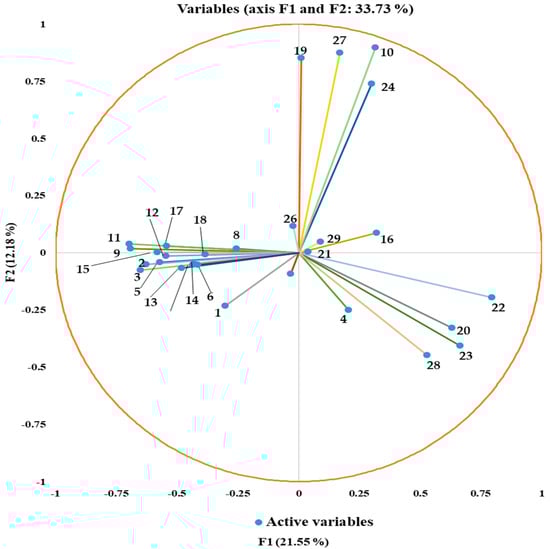 Loading plot of compounds detected in 25 different accessions of Catharanthus roseus by GC–MS: (1) 4H-Pyran-4-one; (2) Catechol; (3) Benzofuran, 2,3-dihydro; (4) 5-Hydroxymethylfurfural; (5) 1,2,3-Propanetriol, 1-acetate/acetin; (6) Ascaridole epoxide; (7) Ascaridole epoxide; (8) Deoxyspergualin; (9) Sucrose; (10) D-fructose; (11) D-allose; (12) Desulphosinigrin; (13) 3′,5′-Dimethoxyacetophenone; (14) α-D-Glucopyranoside, O-α-D-glucopyranosyl-(1.fwdarw.3)-ß-d-fru); (15) 1,2,3,5-Cyclohexanetetrol+; (16) Quinic acid; (17) Myo-Inositol, 4-C-methyl-; (18) Muco-inositol; (19) Hexadecanoic acid, methyl ester; (20) Pentadecanoic acid; (21) Phytol; (22) 9,12,15-Octadecatrienoic acid, methyl ester; (23) 2,20-Cycloaspidospermidine-3-carboxylic acid, Vindolinine; (24) 9,12,15-Octadecatrienoic acid; (25) Octadecane, 3-ethyl-5-(2-ethylbutyl)-; (26) Aspidospermidine-3-carboxylic acid vindoline; (27) Condyfolan, 14,19-didehydro-12-methoxy-, (14E)-; (28) Aspidospermidine-3-carboxylic acid; (29) Phthalic acid, di(oct-3-yl) ester.
