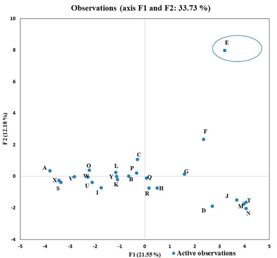 Loading plot of 25 different accessions of Catharanthus roseus based on GC–MS analysis: (A) Cr00PFRE, (B) Cr00LPFLPE, (C) Cr00DPF, (D) Cr00WFYE, (E) Cr00WFRE, (F) Cr00WFRE2, (G) Cr00WFSRE, (H) Cr00WFYE2, (I) Cr00DP, (J) Cr00LP, (K) Cr00BPF, (L) Cr00SFP, (M) Cr00CAF, (N) Cr00LPNF, (O) Cr00SBRF, (P) Cr00PLMF, (Q) Cr00CHEF, (R) Cr00SNFF, (S) Cr00CLF, (T) Cr00SAF, (U) Cr00TDRF, (V) Cr00 DRYE, (W) Cr00FRFF, (X) Cr00PFWE, and (Y) Cr00PFYE).