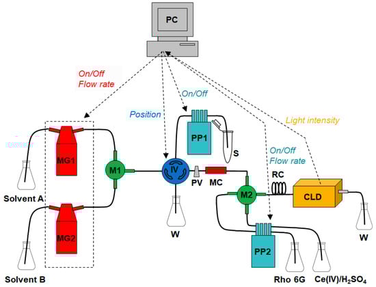 A schematic diagram of the low-pressure chromatography setup is shown in Figure 1. It comprises 2 MilliGAT LF pumps (MG1 and MG2) (Global FIA) for delivery of the 2 solvents, a Minipuls3 pump (PP1) (Gilson) for sample loading, a Minipuls3 pump (PP2) (Gilson) for post-column delivery of the CL reagents, a Cheminert Model C12 six-port sample injector (IV) (VICI Valco) equipped with 40 μL loop for sample injection, a Chromolith RP-18e 5 mm × 4.6 mm monolithic separation column (MC) (Merck), a 3-way mixer (M1) and a 4-way mixer (M2) (Vici Jour), a mixing coil (MC) and a flow-through CL detector constructed in-house (CLD) (described in P1 and shown in Figure S1 of the Supplementary Materials). The peripherals are connected to a personal computer (PC), which performs control and data acquisition. The control of the manifold is described in P1 (Supplementary Materials), while the front panel of the control and data acquisition application developed in LabVIEW 2013 are illustrated in Figure S2 (Supplementary Materials). The flow tubing is Teflon (0.5 mm i.d.) and a pressure-sensitive release valve (PV) (activated at pressure >100 psi, Global FIA) was used to prevent accidental excessive backpressure in the manifold.