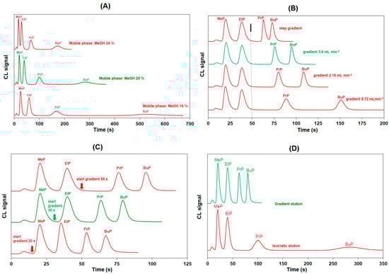 Chromatograms for the separation of the four parabens under different conditions. (A) isocratic elution with different concentrations of MeOH; (B) gradient elution with gradients of different steepness (20% (v/v) MeOH as solvent A, 36% (v/v) MeOH as solvent B, start of gradient at 50 s indicated by black arrow); (C) gradient elution with different starts of gradient (20% (v/v) MeOH as solvent A, 36% (v/v) MeOH as solvent B, gradient 3.6 mL min−2); (D) comparison between isocratic elution and gradient elution with the final conditions.