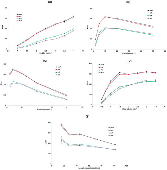 As illustrated in Figure 3A, the CL signal for all the parabens increases with increasing H2SO4 concentration in the H2SO4/Ce(IV) solution in the range studied (1–4 mol L−1); this trend is attributed to the fact that the hydrolysis of parabens, which is necessary for the CL reaction, is favored at strongly acidic conditions. Given the adequate sensitivity of detection, higher concentrations of H2SO4 were not tested to avoid possible chemical attack of the flow components and to reduce reagent consumption. The highest concentration of 4 mol L−1 H2SO4 was finally selected.