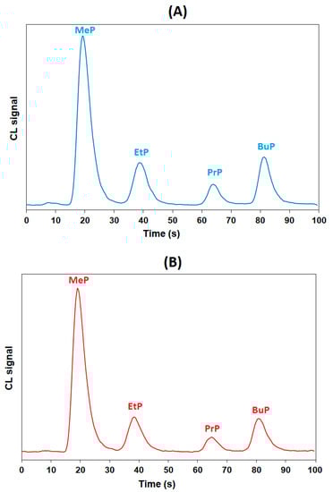Comparative chromatograms of the four parabens with the same elution protocol and UV and CL detection are illustrated in Figure S3 (Supplementary Materials). While the CL detection leads to sharp and well-separated peaks for all the parabens, the UV detection results in the appearance of ghost peaks, distorted baseline and decrease in sensitivity for the PrP and BuP peaks. This effect has been observed before in conjunction with fast solvent gradients in both low-pressure chromatography and HPLC and is attributed to the sudden changes in solvent absorption as the profile of the mobile phase undergoes substantial composition gradients along the separation column [25,26]. Therefore, UV detection is not compatible with the fast elution gradient, which is used in the present work to provide the fast separation of the four parabens, and the advantage of CL detection is evident. Other important advantages of CL detection are the lower cost of the photomultiplier CL detector with respect to a UV–Vis spectrometer and the ability to tailor the detection sensitivity by varying the high-voltage supplied to the photomultiplier unit.