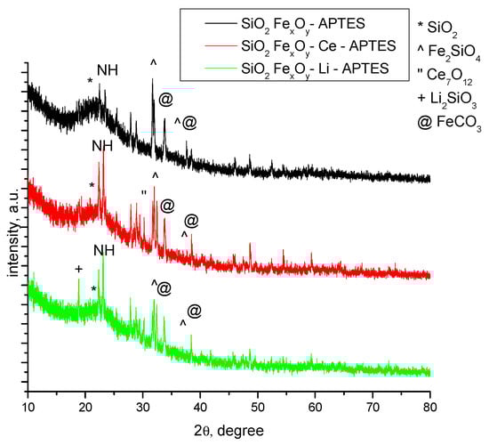 The diffractograms specific for samples functionalized with APTES, SiO2−FexOy−APTES, SiO2−FexOy–Ce–APTES, and SiO2−FexOy−Li−APTES are presented in Figure 2. After functionalization, the SiO2−FexOy−APTES sample undergoes several changes as, alongside SiO2 (01-083-2467) and Fe2SiO4 (01-083-2074), the sample presents the formation of FeCO3 (00-003-0746) phase [41]. The peaks specific to FeCO3 at 2θ = 31° with 1 0 4 (hkl) were observed for all functionalized samples. Similarly, in the case of SiO2-FexOy–Li–APTES sample, we also observed the formation of FeCO3.