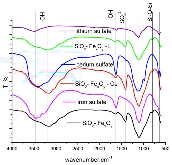 The specific FT-IR bands recorded for the obtained materials are presented in Figure 3. The resulting SiO2 phase is confirmed by the presence of specific bands at 800 cm−1 and 1100 cm−1, where Si-O-Si siloxane bonds are formed. At the same time, the presence of OH species is highlighted at 3400 cm−1 and 1640 cm−1. The presence of Fe-O bonds is highlighted by the specific band at 620 cm−1. The specific bands for iron sulphate, cerium sulfate, and lithium sulfate, respectively, are present and shown in Figure 1. It can be seen that most of the bands overlap with those specific to silica and iron oxide (Fe2O3), with small shifts due to the addition of cerium and lithium sulfate. One of the main bands, SO42, also appears at 1100 cm−1, and the shifts are due to the new bonds formed with the silica matrix [43]. The specific band for SO42− can also be observed at 1430 cm−1.