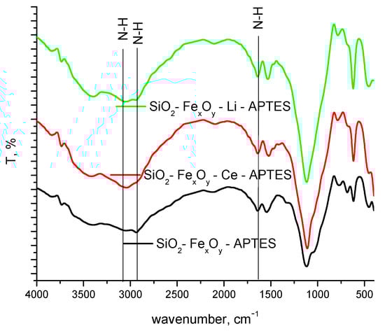 From the FT-IR spectrum, the formation of specific amine bands is observed as a consequence of their functionalization (Figure 4). At 3100 and 2900 cm−1, the specific N-H stretching band is put in evidence, followed by the 1520 cm−1 specific for N-H bending band. It is observed that once cerium sulfate or lithium sulfate is introduced, hypochromic effects influence the aforementioned bands [44].