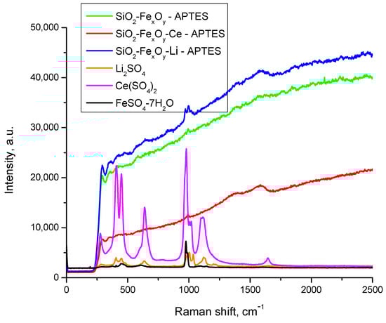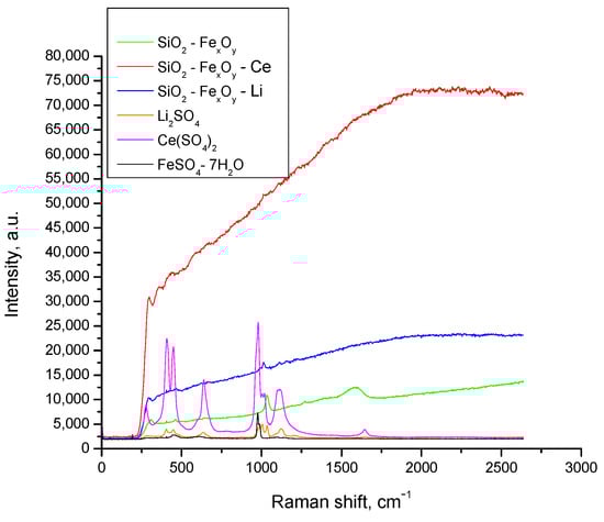 The Raman spectra are presented in Figure 5. Regarding the composition of the materials, sulfate related and Si-O bonds are expected to be observed. Since Raman spectroscopy has lower accuracy regarding the metals, they are not expected to be very visible. Although, alongside Fe, other metal sources are present (Li and Ce), there are not expected to be changes between the compounds, since the metal interactions are usually weak and the added content is relatively small in concentration. The intensity of the aforementioned peaks may also vary, since some of the materials are exhibiting higher fluorescence, making it difficult to distinguish the existent bands. Spectra of the starting materials (FeSO4·7H2O, Ce(SO4)2, Li2SO4) were also included for better clarity. Since there are similarities for all compounds, in the 900–1100 cm−1 region, the vibrations characteristic for SO42− anion shows a symmetric and asymmetric S−O stretching mode. In the 450–1100 cm−1 region, due to sulfate–water interactions, a symmetric and asymmetric O−S−O bending mode takes place [45,46,47].