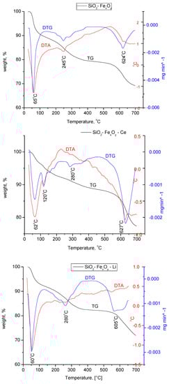 From Figure 7, we can pursue the stability and structural changes that occur in the synthesized materials. It can be seen that the basic sample, SiO2−FexOy, indicates a total loss of 30%. The decomposition of the material takes place in four stages. The first part of the process indicates a mass loss of 4.8% in the range of 25–150 °C specific to the physically adsorbed water and corresponding to an endothermic process at 65 °C. In the case of samples with a cerium base, a second endothermic process take place at 120 °C, which is specific to a second loss of water molecules.